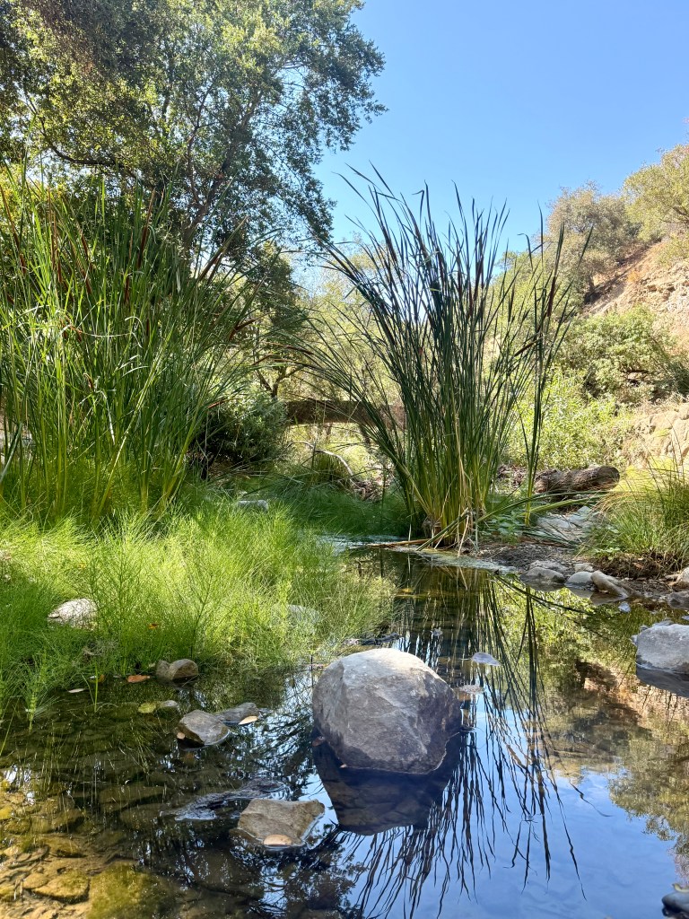 After making my offering, I felt called to step into the shallow water of the creek. Standing barefoot, I began drumming slowly, inviting myself into deeper connection with the water element and the surrounding. I listened and waited for what was ready to flow through me. After some slow drumbeats, a soul song began to flow through me. Birds were singing all around me and some flew across the creek throughout the whole song.